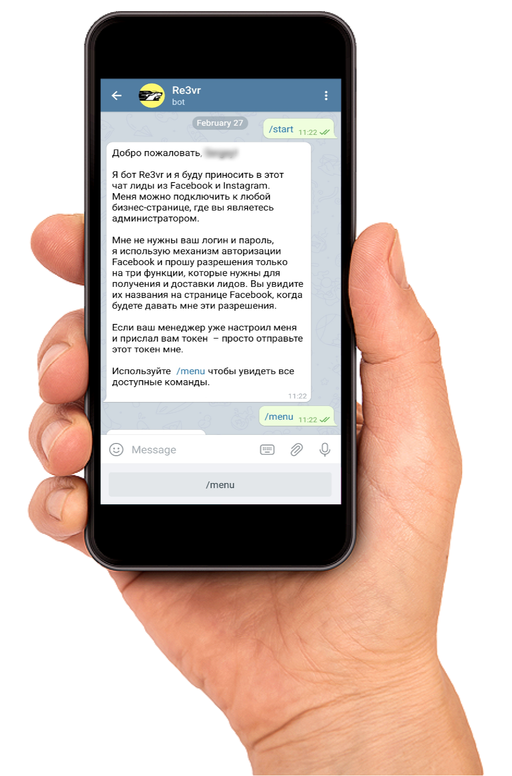Ты должен знать только Telegram-аккаунт получателя лидов. Нажми кнопку 'Управление страницами' в Главном меню. Выбери страницу и сгенерируй токен. Теперь отправь его новому получателю вместе с именем бота @re3vr_bot. Новый получатель должен зайти в бота и отправить ему токен.